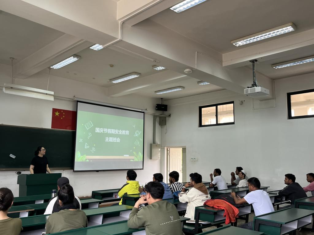 为保障留学生度过一个平安愉快的国庆假期,国际学院于2024年9月27日组织留学生开展安全教育主题班会。